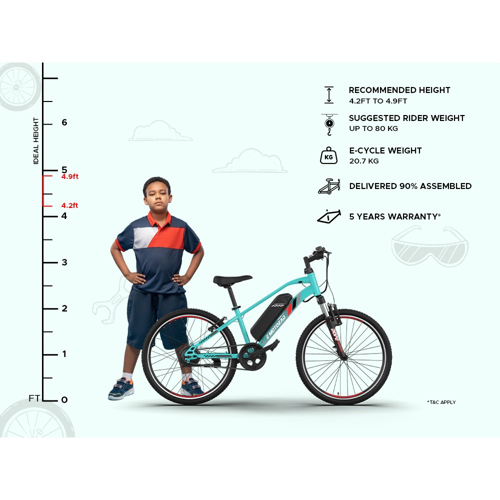 The Dope is more than just a kids’ cycle, it’s their first taste of the electric ride revolution! With a high tensile steel frame, 24” tyres, and a safe yet thrilling 250W motor, it balances excitement with security. A removable 5.2Ah battery, V-brakes with auto cut-off, suspension fork, and integrated display make it the most complete e-bike for kids aged 8–12.