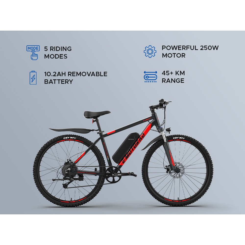 ₹29,999.00 -₹3,500.00 ₹26,499.00Frame : High Tensile Steel Frame Gears : Single Speed Range : 35+ KM Tyre : 27.5"x 2.1" Suspension : Front Suspension with 100 mm Travel Display : battery indicator Battery : 7.65AH Rider Weight Capacity : Up to 110 KG Rider Height : 5"3 ft. to 6 ft. Frame Warranty : 5 Years- -₹3,500.00