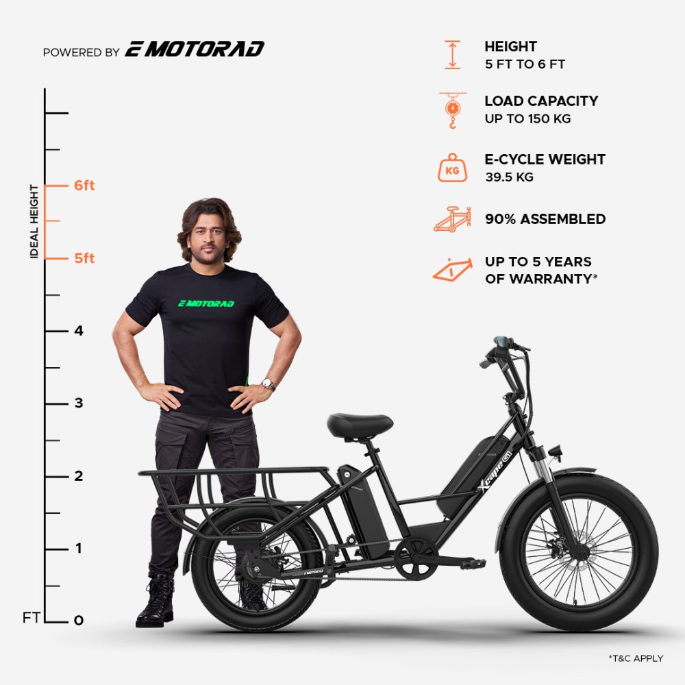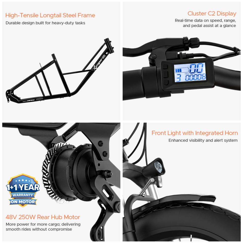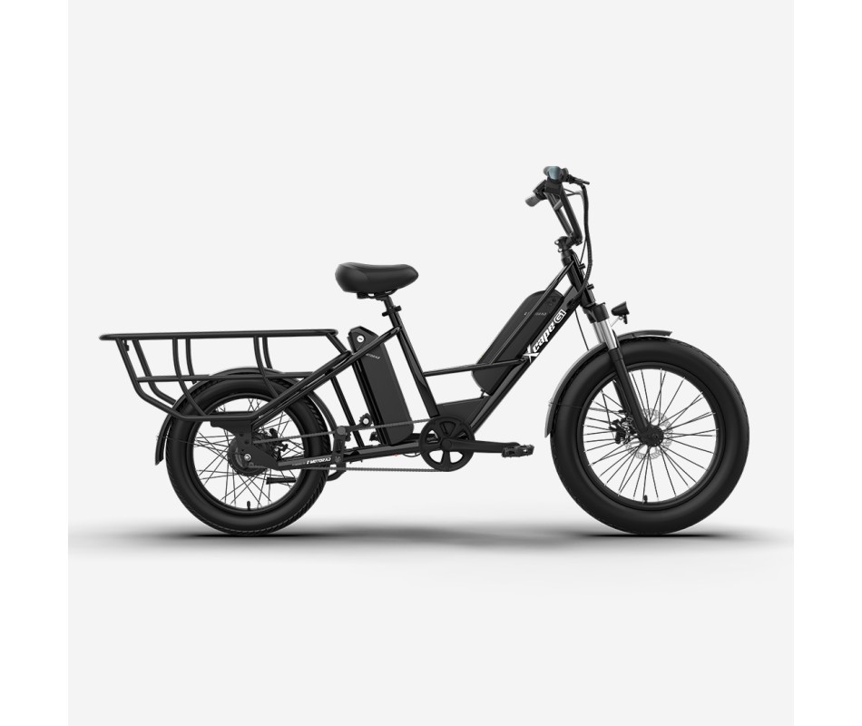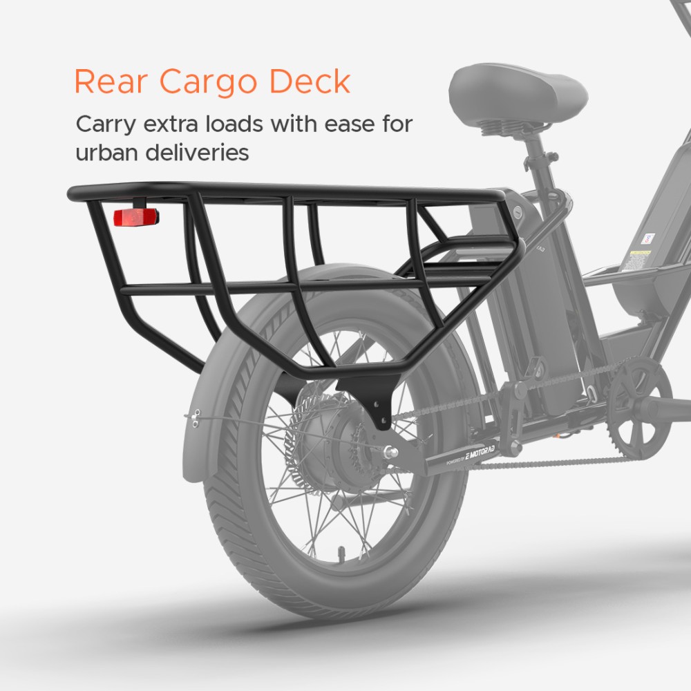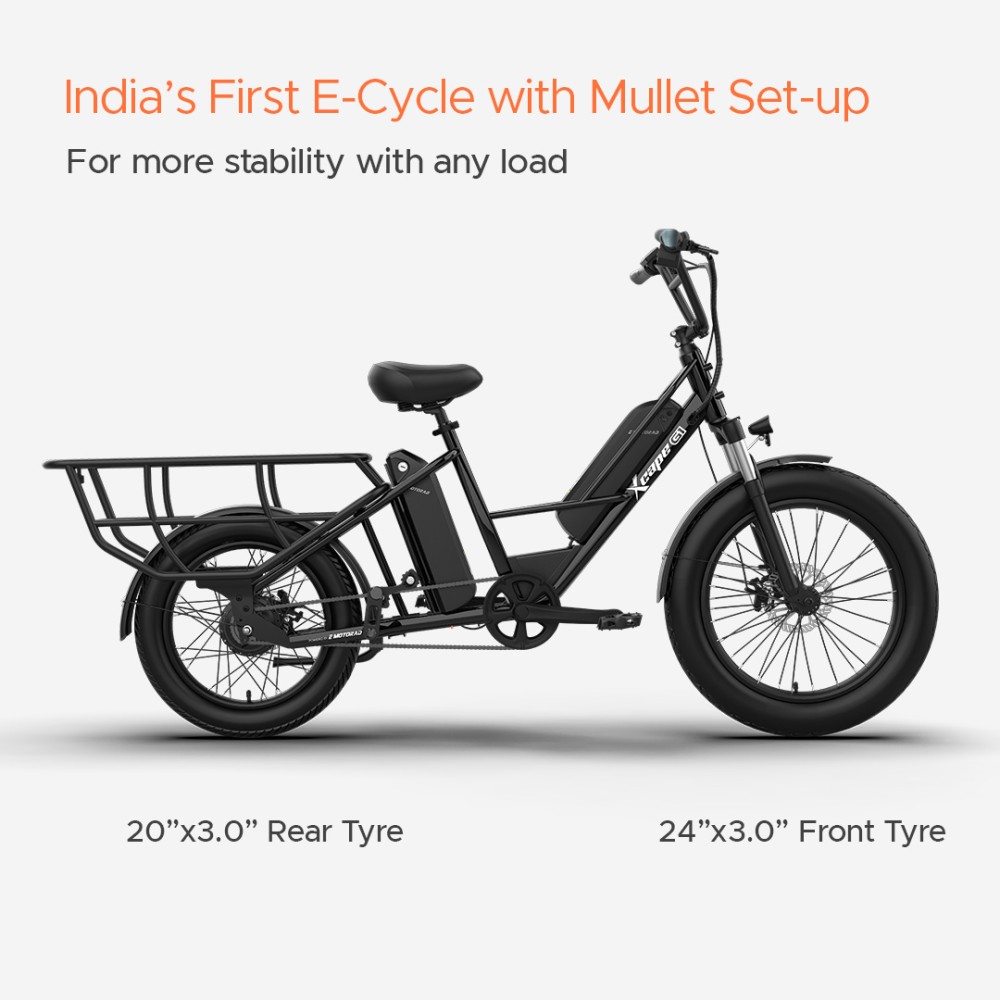 The G1 isn’t just an e-cycle—it’s a powerhouse of durability and performance, designed to handle heavy loads and long rides with ease. Its high-tensile longtail steel frame supports up to 150 kg, while dual 48V 10.2Ah removable batteries provide an impressive range of up to 100 km on the pedal assist. Powered by a 250W rear hub motor and equipped with 24"x3.0" front and 20"x3.0" rear tyres for superior stability, the G1 delivers smooth, safe rides across any terrain. With features like 80mm front suspension, 180mm mechanical disc brakes, and a multifunctional display, it’s built for practicality, reliability, and everyday adventures.